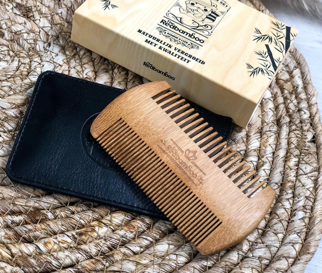 The Red Bamboo baardkam is gemaakt is van bamboe. Hierdoor gaat hij ontzettend lang mee en is deze ook hartstikke stevig. Daarnaast heeft hij een ideaal formaat, waardoor deze makkelijk in je hand past. Deze baard kam komt met een handige lederen beschermhoes.