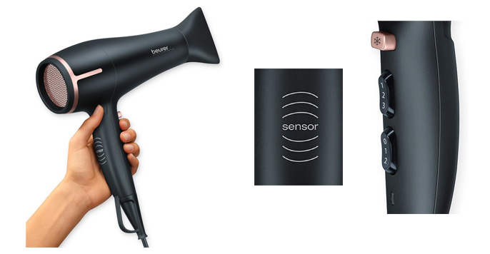 De aan en uit knop van deze föhn is een touch knop. Wanneer deze word aangeraakt schakelt hij automatisch aan of uit. Naast dit technische snufje beschikt de föhn over 3 warmtestanden, 2 blaasstanden, een led display, een koude lucht stand die vergrendelbaar is, oververhitting bescherming, een diffuser en smalle blaasmond.